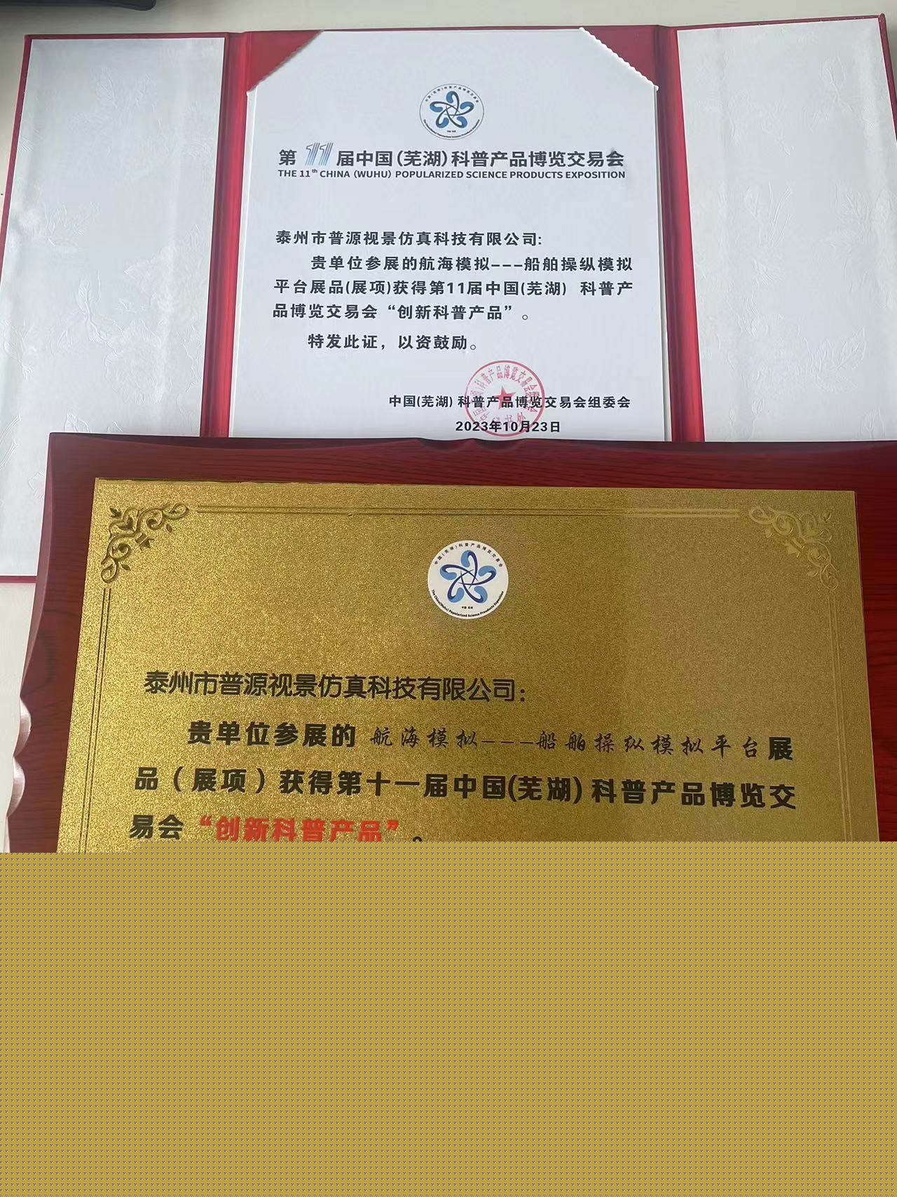 泰州市普源視景仿真科技有限公司航海模擬平臺(tái)榮獲“創(chuàng)新科普產(chǎn)品”稱號(hào)