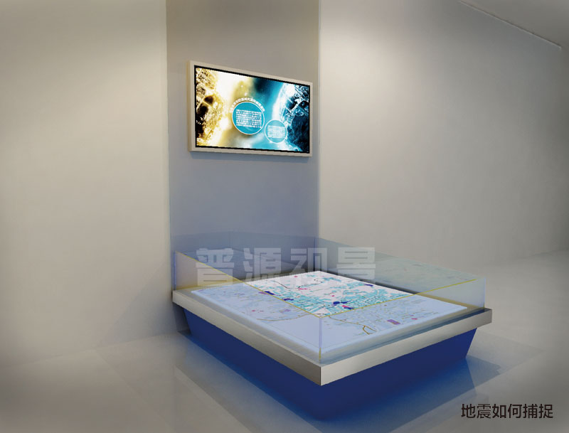 展項由一個2平方米左右的地臺和拾震傳感器組成,地臺表面覆蓋中國地圖,讓觀眾示意性的在模擬地區(qū)制造地震。模擬測震系統(tǒng)能迅速捕捉信號,并確定所制造的地震所在的序列號和顯示震動波形,同步的多媒體軟件實現(xiàn)實時顯示地震發(fā)生的地點和時間?筛鶕(jù)投沙包的力度大小,拾震傳感器可同步實時判斷出模擬震級的大小并在動畫中顯示,從而實現(xiàn)地震三要素的確定。